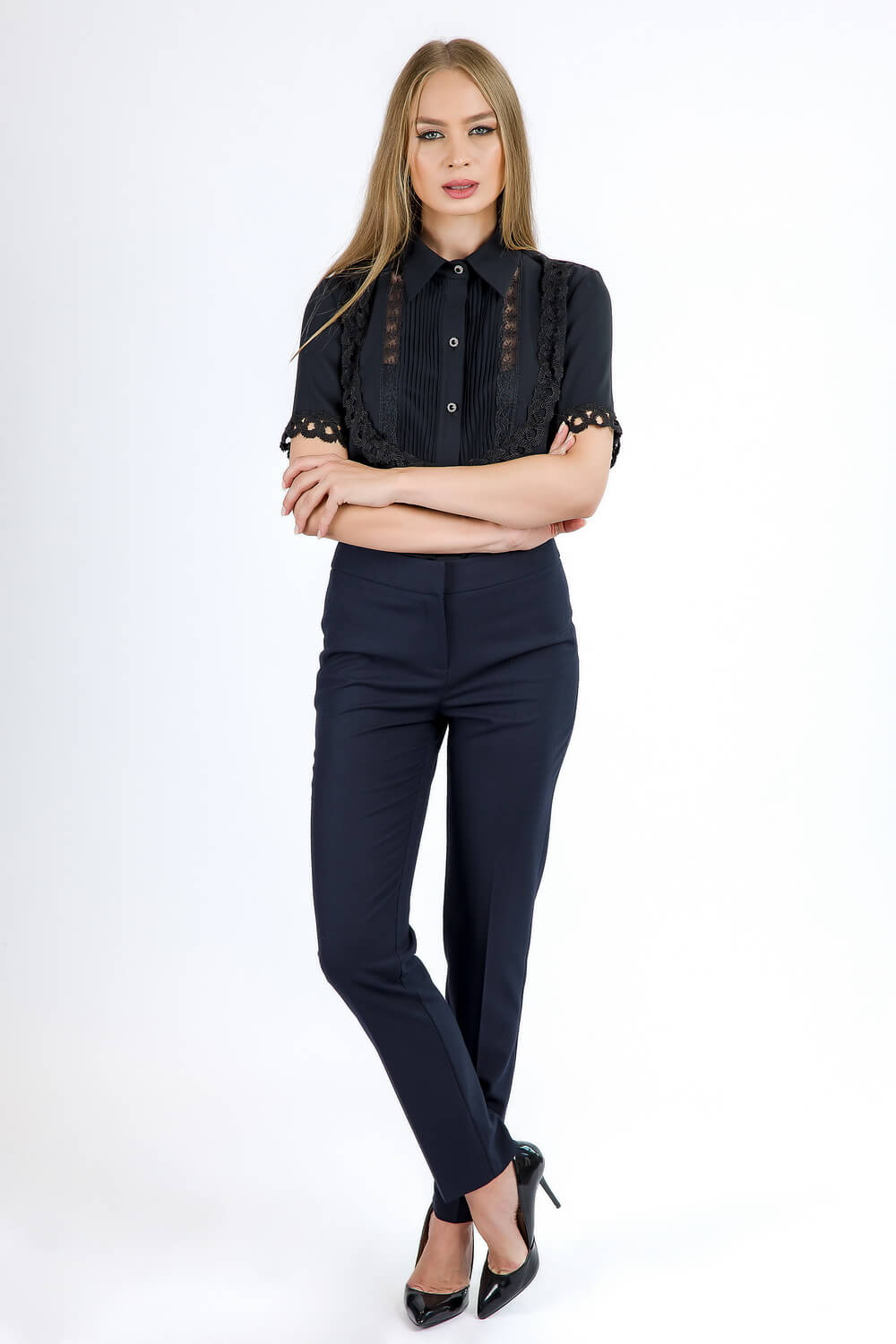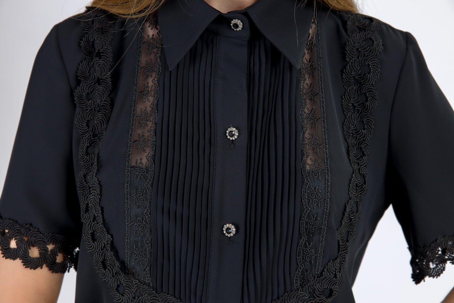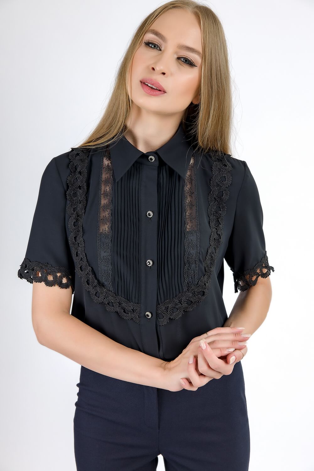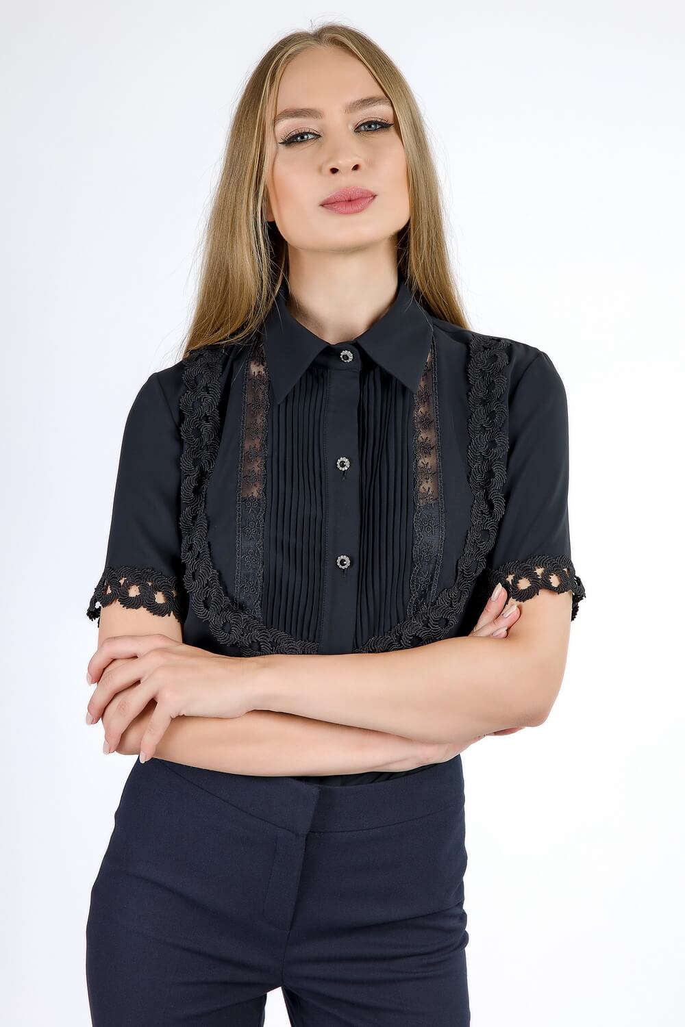 Croiul bluzei si combinatiile de dantela si triplu voal fac accesibila bluza oricare tinute
